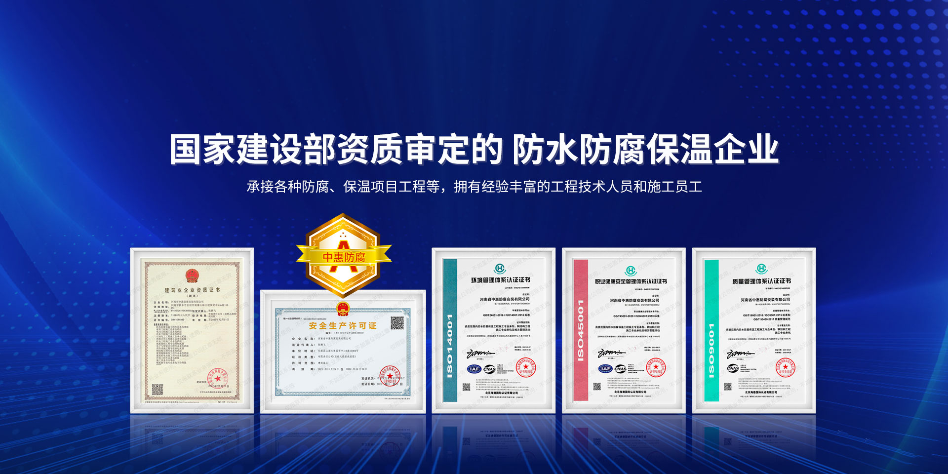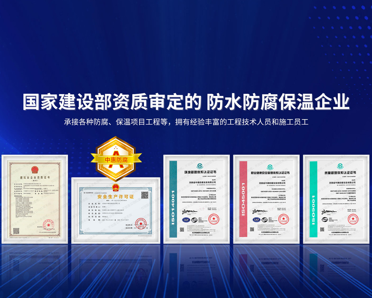 公司經營范圍:防水防腐保溫工程;消防設施工程;建筑裝修裝飾工程;建筑機電安裝工程;電力工程;建筑工程;石油化工工程;工業清洗工程;油罐清洗工程;鋼結構工程;環保工程;模板腳手架工程;電纜防火封堵、防污閃噴涂、外墻外保溫工程;各類施工勞務作業;設備維修、船舶鉚焊、涂裝;電力工程材料、建材、防水材料、防火材料、防腐保溫材料銷售,并相繼通過了GB/T19001-2008idtISO9001:2008GB/T50430-2007質量管理體系認證證書。GB/T24001-2004idtISO14001:2004環境管理體系認證證書。GB/T28001-2011idtOHSAS18001:2007職業健康安全管理體系認證證書。公司是中國防腐蝕于防護協會、中國施工企業管理協會、電力協會和中國鋼結構防水協會會員單位。 公司的經營業務涵蓋了石油、化工、電力、冶金、煤炭、船舶、國防、燃氣、水利、環保、交通運輸、航空及國防軍工和輕紡市政等行業的防腐保溫絕熱設備。鋼結構安裝、防火、防水、金屬噴鍍、聚脲噴繪、陰極保護、防滲透堵漏、玻璃鋼及各種磚版材料襯里、橡膠襯里、煙氣硫和耐酸溶劑腐蝕等工程施工。公司連續十年榮獲“省市先進施工企業”“安全生產先進單位”“重合同,守信用企業”和“AA***資質企業”的稱號。2000年被命名為市級文明單位,2002年被國家工商行政管理局命名為“重合同,守信用的企業”、被中國工業防腐蝕技術協會命名為“防腐蝕企業,能源節約及環境保護領域有豐富的經驗和***的業績。工程一次交驗合格率100%。其中攀枝花鋼鐵公司煉鐵廠四號高爐及熱風爐防腐工程、上海寶鋼公司煤氣柜防腐工程、撫順石油一廠裝置防腐項目、齊魯石化公司稀烴廠高塔防腐工程、吉林化學工業公司煉油廠油罐防腐工程、天津石化熱電廠六號爐頂棚聯絡管保溫工程、大慶油田(太倉)力神泵業工程、中國化學工程第十一建設工程、中原油田勘探局工程、中國石化銷售有限公司華北分部、魯皖輸油管道工程、貴州開磷息烽合成氨工程、陜西黃陵煤化工程、中國石油天然氣西部管道塔里木輸油工程、邯鋼集團邯寶鋼鐵公司煉鐵工程、德州供電工程、吉寶(南通)船廠工程,偃師華潤熱力工程、鄭州熱力總公司。 河南省中惠防腐安裝有限公司愿以豐富的施工經驗,***的技術,***的設備,***的管理,***的服務,竭誠為國內外廣大的用戶提供***滿意、******的工程作品。 我公司愿與國內外同仁一道,團結協作,共同推進防腐蝕行業發展! 公司地址:河南省長垣縣建設路北段360號 固定電話:0373-8866488 郵編:453400 網址:http://www_zhff_com_cn.sysmws.com